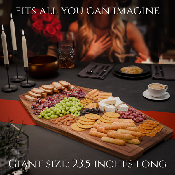 The extra-large surface fits tons of food—think meats, cheeses, sweets, or even a full skeleton charcuterie display. It's sanded multiple times to achieve a silky feel and built from heavy-duty hardwood (not bamboo), making it as sturdy as it is stylish.