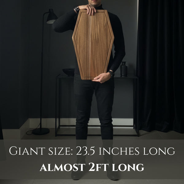 Step up your spooky hosting game with this giant coffin-shaped charcuterie board, crafted from solid acacia wood and measuring 23.5" tall by 14.5" wide. With its haunting silhouette and luxurious smooth finish, this oversized board is made for Halloween fanatics, goth decor lovers, and anyone who wants to serve snacks with a macabre twist.